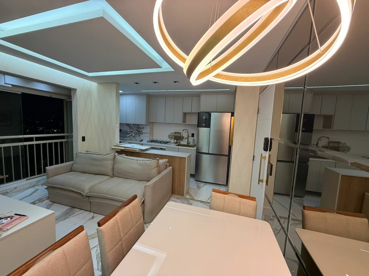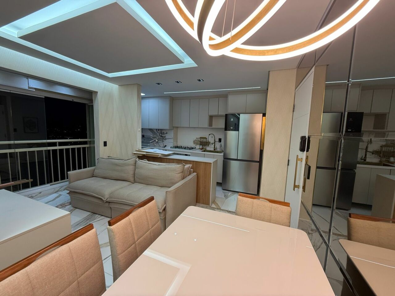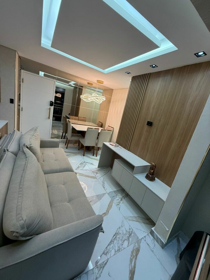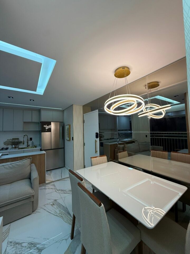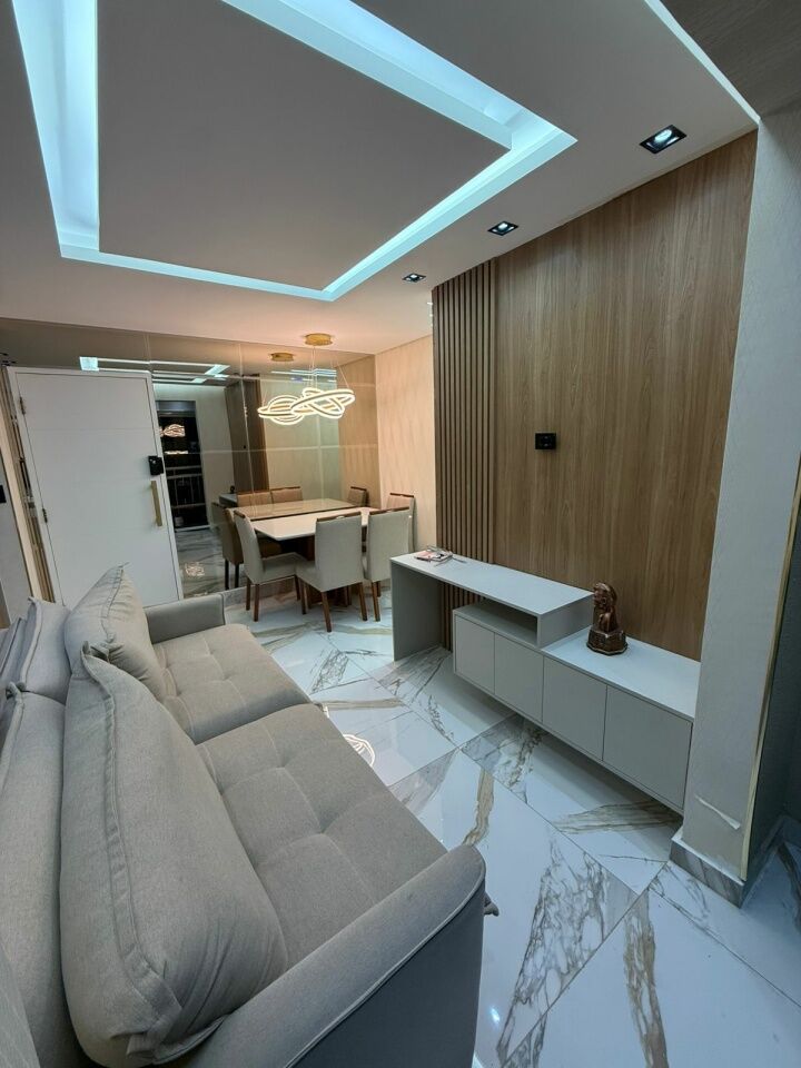 Lindo apto todo reformado e automatizado, com 2 quartos com móveis planejados e camas, banheiro, sala com sacada, rack, mesa de jantar, e sofá, cozinha planejada com fogão.
