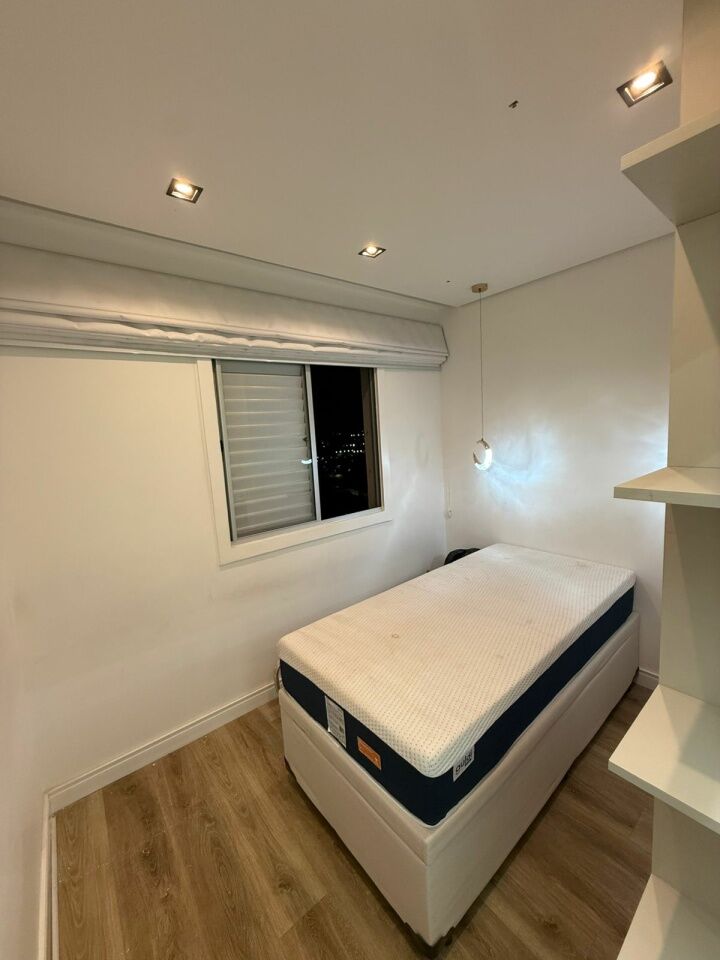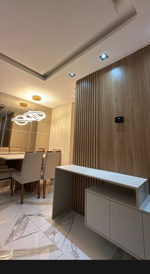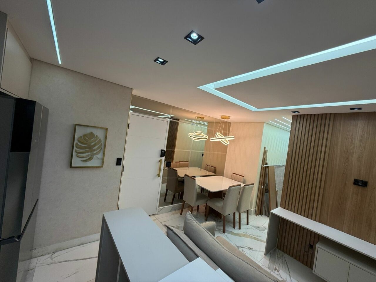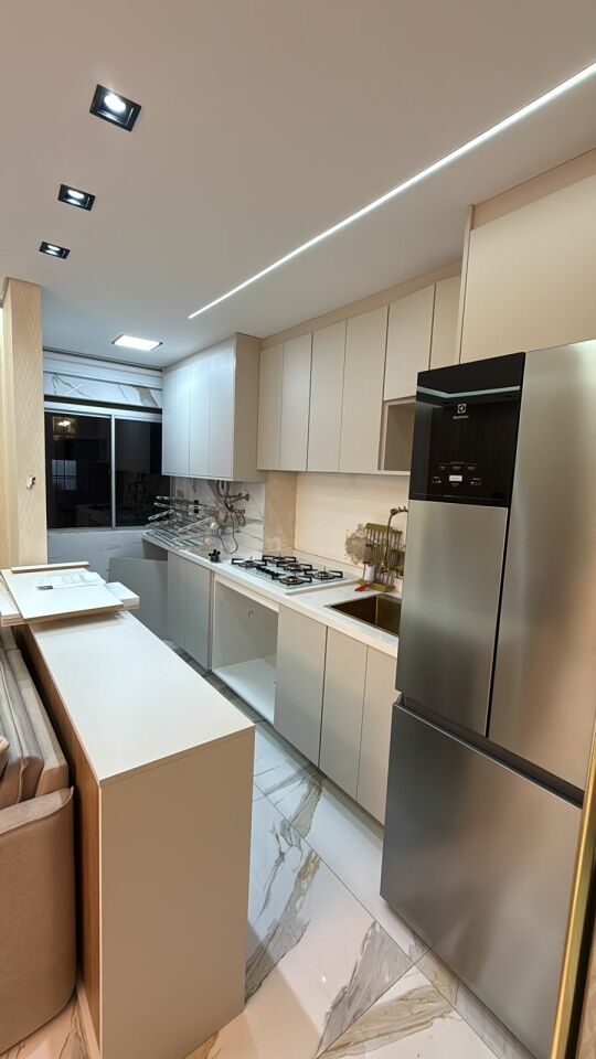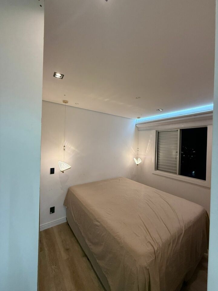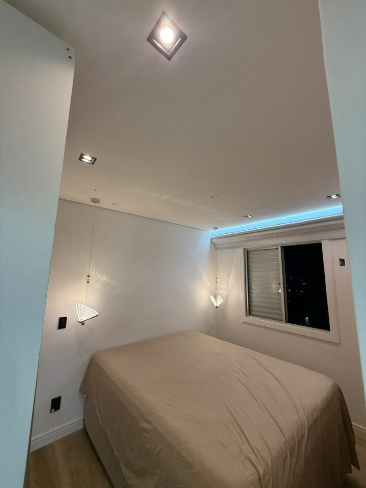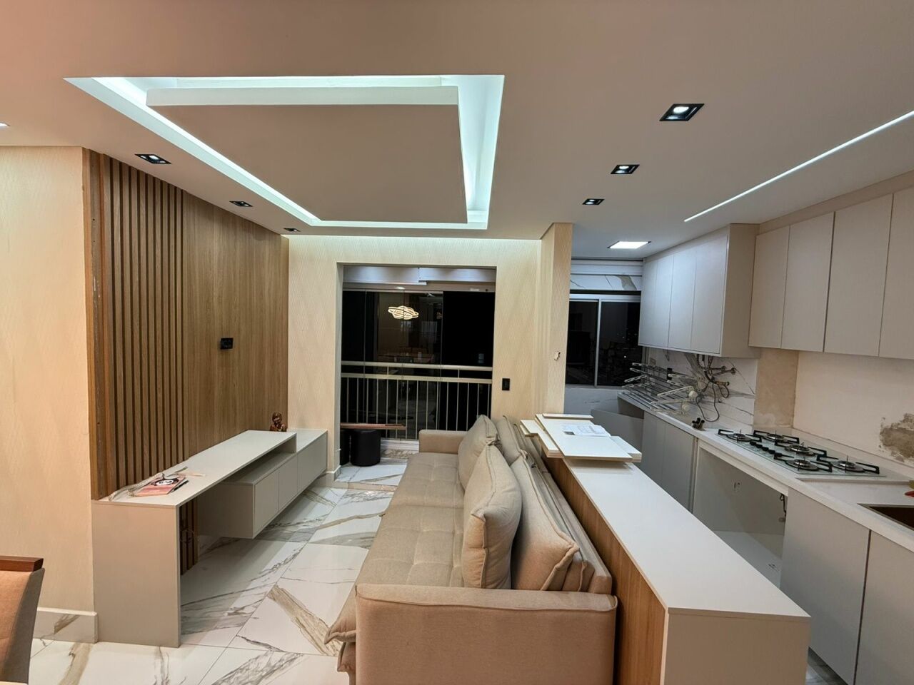 Lindo apto todo reformado e automatizado, com 2 quartos com móveis planejados e camas, banheiro, sala com sacada, rack, mesa de jantar, e sofá, cozinha planejada com fogão.