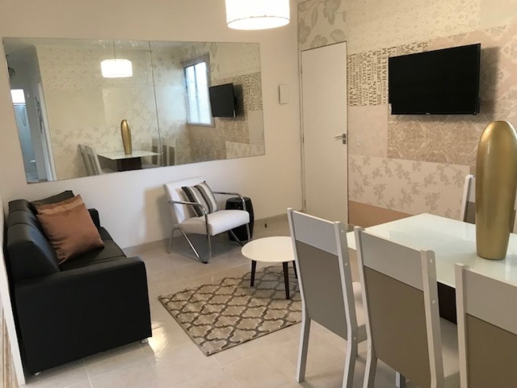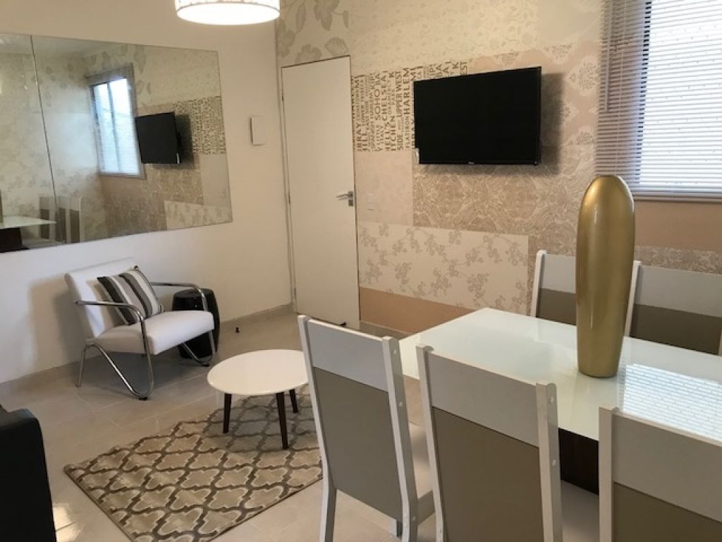 3 dormitórios, banheiro, sala para 2 ambientes , cozinha e área de serviço. Area útil de 63 m2, 1 vaga livre coberta. Apto. totalmente mobiliado, com todos os móveis, eletrodomésticos e armários modulados em 2 dos 3 dormitórios e no banheiro. Decoração lindíssima, feita por profissional da área.